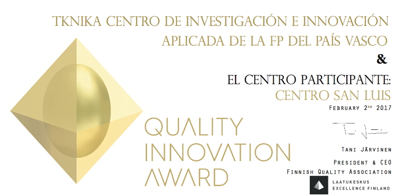 Como participante en el proyecto de innovación en la Educación que lidera Tknika, el Centro San Luis ha recibido el reconocimiento en la Quality Innovation Award 2016.