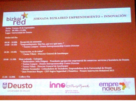 18/09/2015 - InformaciónNos hemos ido hasta la Universidad de Deusto para participar en una jornada dinámica y de alto valor en sus contenidos y ponentes. La jornada se llamaba EMPRENDIMIENTO e INNOVACIÓN, contando para ello con Tontxu Campos, Deusto Entrepreneurship Centre Director y Txema Villate, Director General de Innobasque, expertos en ambas materias.