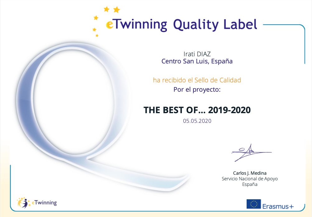 ¡ Enhorabuena por el reconocimiento eTwinning ! un sello de calidad al proyecto The Best of...2019-2020.